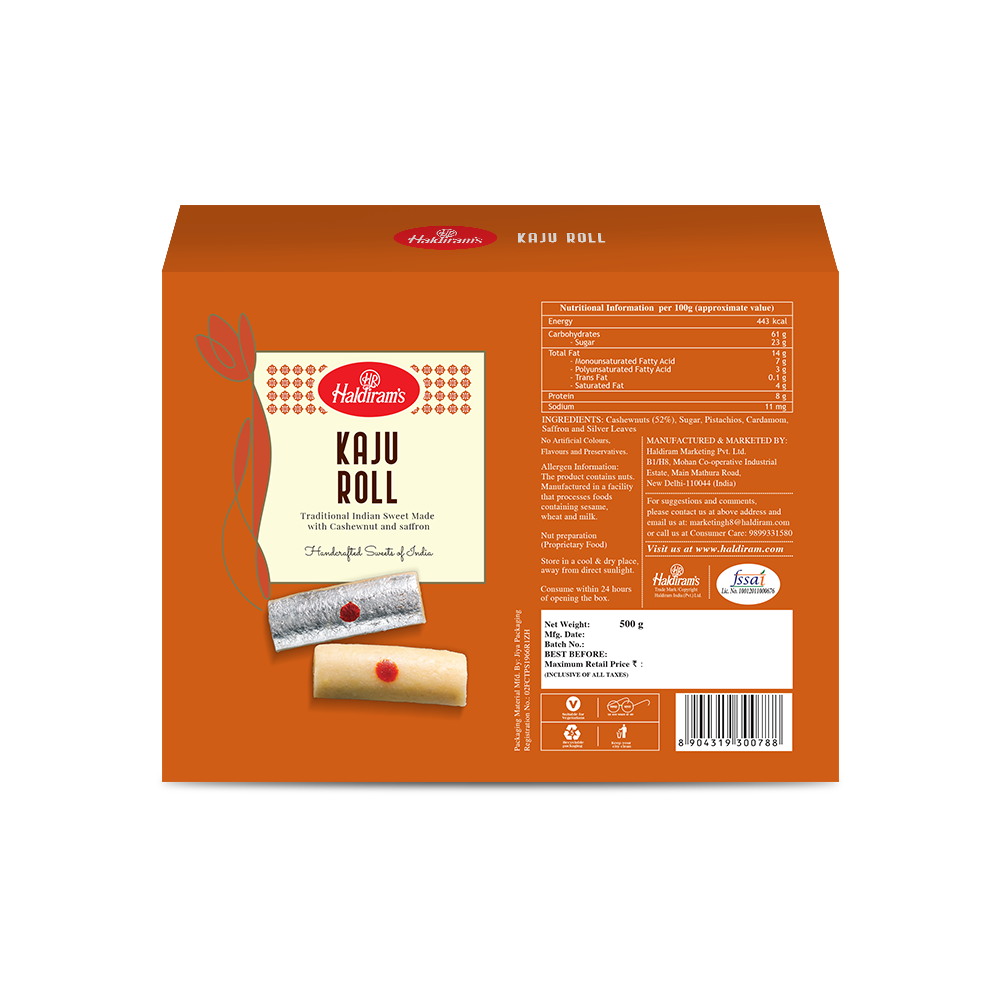 Experience the art of perfection with Haldiram’s Cashew Rolls. This delectable sweet is made with pistachios and saffron rolled in cashew fudge, providing a mouth-watering taste in every bite. With Haldiram’s commitment to quality, you can be assured of getting the best product that’s hygienic and delicious at the same time. Experience the essence of Indian Sweets and enjoy the rich flavours of cashew with Haldiram’s Kaju Roll.